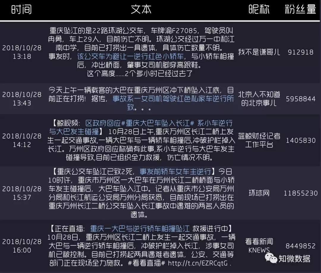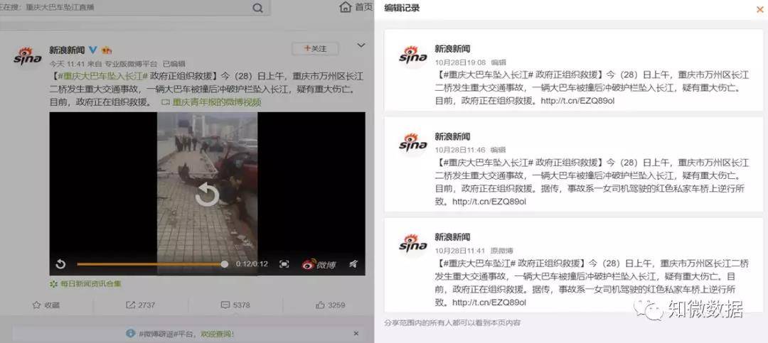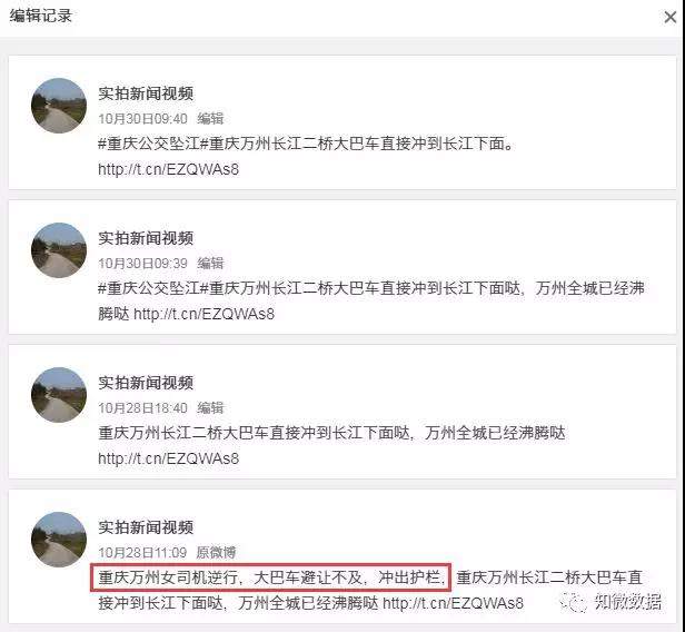 微博平台可追溯到最早的“逆行”説法來自一個名為@實拍新聞視頻 的賬號,從歷史內容來看,發佈內容以各地社會熱點、獵奇視頻為主,11:09分,其發佈了“重慶萬州女司機逆行,大巴車避讓不及,衝出護欄,重慶萬州長江二橋大巴車直接衝到長江下面噠,萬州全城已經沸騰噠 ”,雖然在官方闢謠後目前其已經將逆行部分的內容刪去,但是從編輯記錄中仍可看到當時的微博原文。