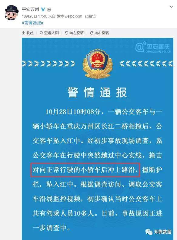 警方@平安萬州 首次通報在12:03分,通報中表示“事故原因正調查中”,在17:46,其再度發佈通報,“公交客車突然越過中心實線”、“撞擊對向正常行駛的小轎車”等反轉引起軒然大波。