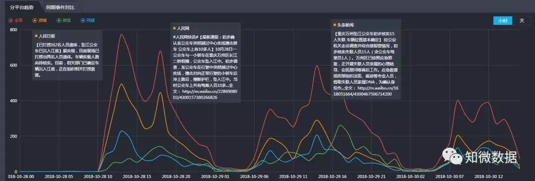 知微事見數據顯示,事件首個熱度峯值出現在28日下午13時,多家媒體報道了“已打撈出2名人員遺體”的消息,隨後的峯值便是18時,警方正式通報事故原因後。29日,“重慶萬州墜江公交車初步核實15人失聯 車輛位置基本確定”仍在持續引發熱議。