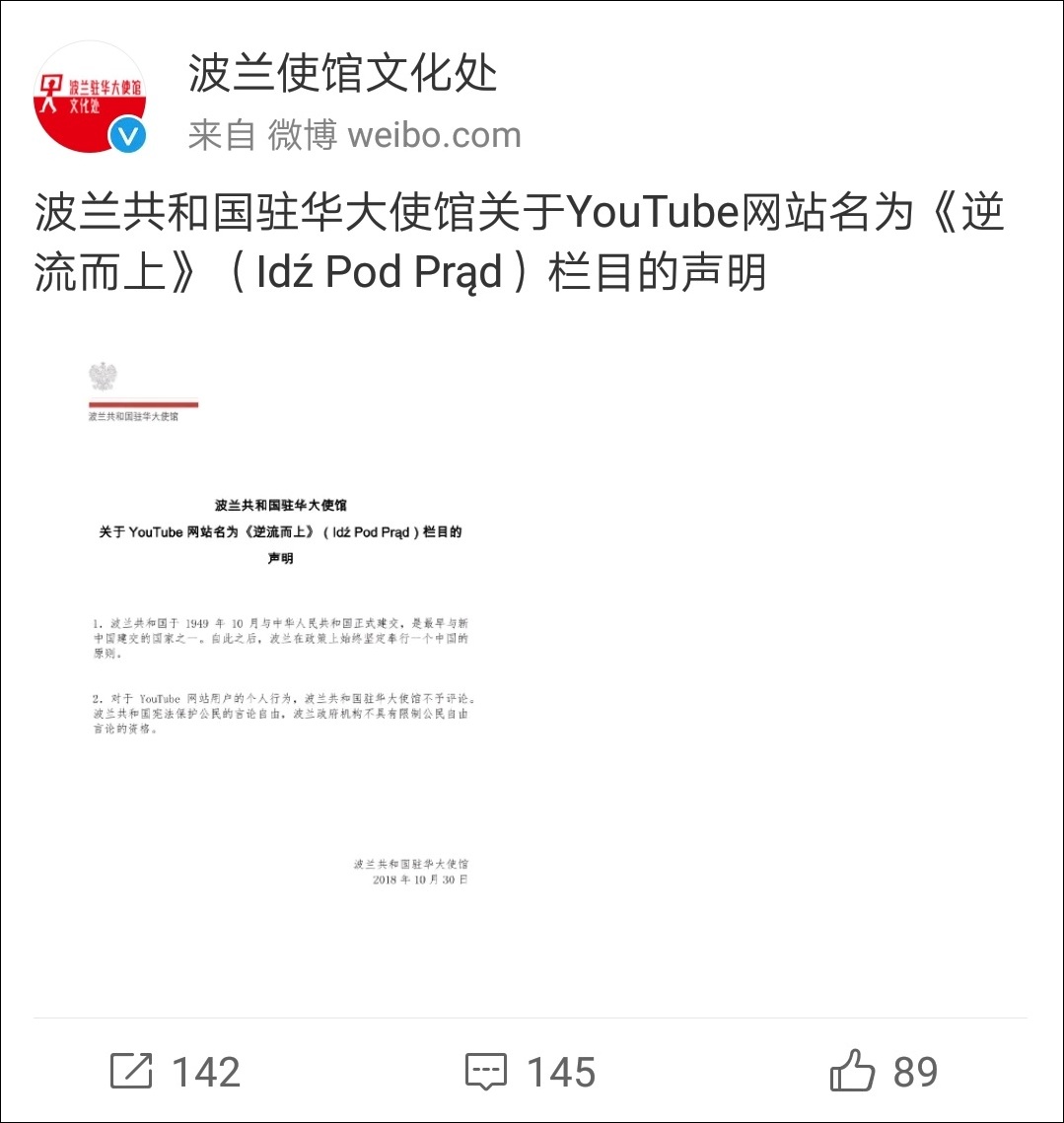 2.對於YouTube網站用户的個人行為。波蘭共和國駐華大使館不予評論。波蘭共和國憲法保護公民的言論自由,波蘭政府機構不具有限制公民自由言論的資格。