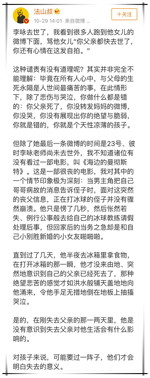 李詠去世了,我看到很多人跑到他女兒的微博下面,罵他女兒“你父親都快去世了,你還有心情在這發自拍。”這種譴責有沒有道理呢?其實並非完全不能理解:畢竟在所有人心中,與父母的生死永隔是人世間最痛苦的事,在此情形下,除了悲傷與哭泣,你做什麼都是錯的:你父親死了,你沒轉發媽媽的微博,你沒哭,你沒有展現出你的絕望與脆弱,你就是錯的,你就是個天性涼薄的孩子。但除了她最後一條微博的時間是23號、彼時李詠老師尚未去世外,我不知道諸位有沒有看過一部電影,叫《海邊的曼徹斯特》。這是一部很喪的電影,我對其中的一個情節印象極為深刻:當男主角把自己哥哥病故的消息告訴侄子時,面對這突然的喪父信息,正在打冰球的侄子並沒有驟然崩潰。他只是愣了幾秒,然後悵然若失、例行公事般去給自己的冰球教練請假處理後事,但回家後的當務之急卻是和自己小別勝新婚的小女友啪啪啪。直到過了幾天,他半夜去冰箱裏拿食物,在打開冰箱的那一瞬,他才沒來由地、突然地意識到自己的父親已經死去了,那種絕望悲苦的感覺才如洪水般鋪天蓋地地向他湧來,令他手足無措地倒在地板上抽搐哭泣。是的,在剛失去父親的那一兩天裏,他是沒有意識到失去父親對他生活會有什麼影響的。對孩子來説,可能要過一陣子,他們才會明白失去的意義。就像很多遭遇父母離異的孩子,在父母離異的那一天他們是不會意識到父母的離異對他們來説意味着什麼的,只有到某個不起眼的瞬間,比如看到好朋友父母一起來參加家長會、比如看到同桌父慈母愛時,他們才會意識到父母離異對自己意味着什麼。**而這種到對方女兒微博下面,罵她為什麼不悲傷的行為,不僅刻薄,而且愚蠢。****你們有什麼資格罵一個註定痛苦的人不喊痛呢?**那唾沫橫飛的樣子,彷彿失去父親的那個人是你們自己。**人類啊,總是正站在自以為是的制高點上,通過罵受害者的不足來彰顯自己的道德與崇高。**儘管事情的真相他們不清楚,痛苦的真實他們也不明白。一個真正心存善念的人,在看到一個孩子失去她的父親時,期待的,絕對不會是看她嚎啕痛哭的畫面,而是希望她早日走出來,早日習慣,樂觀,微笑,勇敢地繼續自己未來的生活。希望姑娘不要受這些旁人的叨擾,在未來依舊樂觀地面對屬於自己的、五味雜陳的人生。餘華在《活着》裏説過這麼一句話,我覺得送給她非常合適:活着是自己去感受活着的幸福和辛苦,無聊和平庸;倖存,不過是旁人的評價罷了。