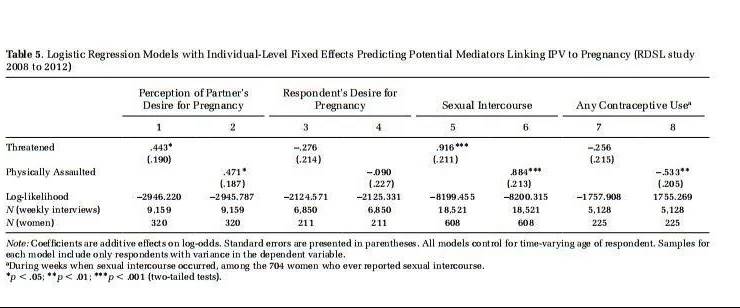 表5顯示,就可能將IPV與較高妊娠率掛鈎的調節變量(懷孕意願、性交與避孕)而言,年輕女性在全面體驗IPV時風險較高。 她們的伴侶有更多的懷孕慾望,更多的性行為。在暴力週期間,女性自己的懷孕慾望並不高(或低),因此它不能解釋為什麼暴力週期會產生更多的懷孕。