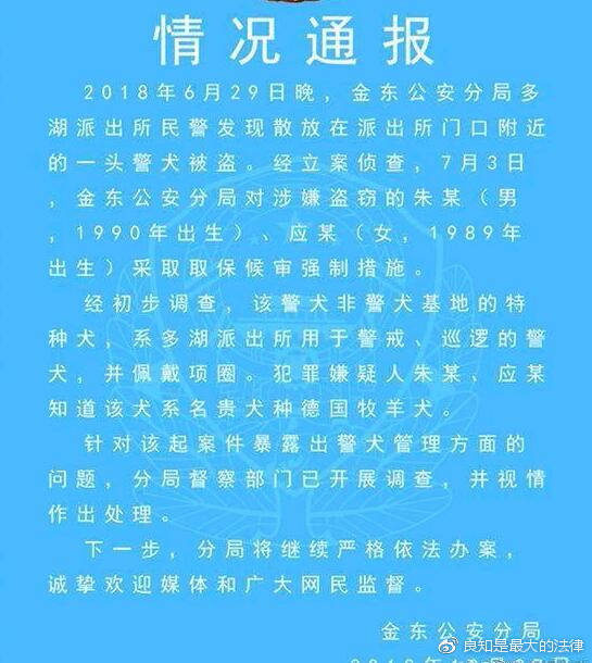 針對該起案件暴露出警犬管理方面的問題,分局督察部門已開展調查,並視情作出處理。下一步,分局將繼續嚴格依法辦案,誠摯歡迎媒體和廣大網民監督。
