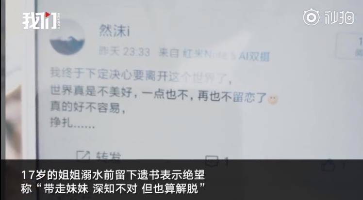 另外在姐姐留下的遺書中,她也稱,自己知道這不關妹妹的事,“帶走妹妹深知不對,但也算幫她解脱”。