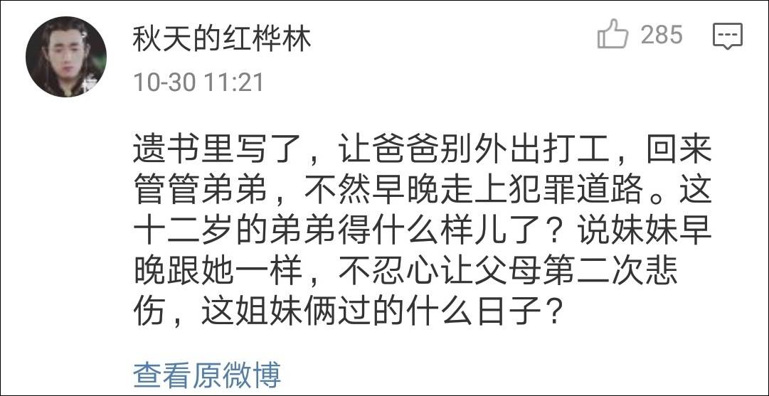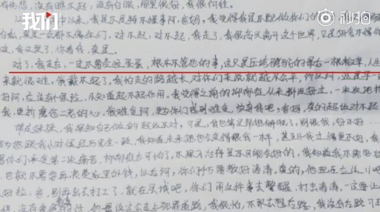 而再仔細回看遺書可以發現,這位17歲的姐姐患有抑鬱症,父親長期在外務工,母親一人獨自在家中撫養三個子女。12歲弟弟的蠻橫驕縱,讓姐姐感到不滿,她在遺書中強烈地表達了希望父親回家管教弟弟的意願,並且認為如果再不管教,弟弟有可能走上犯罪的道路。