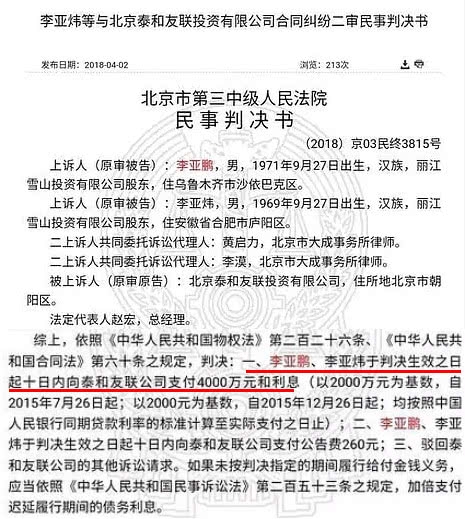 後來李亞鵬麗江雪山投資有限公司被告,被法院要求賠償4000萬。(判決書傳送門)