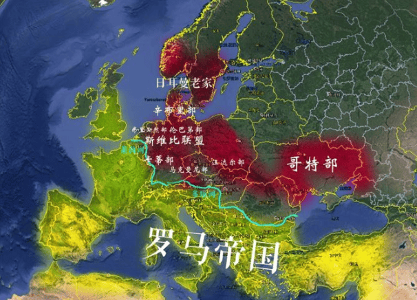 圖 羅馬帝國(黃色)和北邊以日耳曼蠻族(紅色)的敵對。