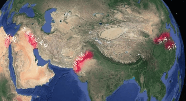 嚴格來講,什麼古巴比倫、古埃及、古印度、古中國這樣的詞彙,並不正確。合適的説法應該是四條大河流域的文明——尼羅河文明、兩河文明(美索不達米亞)、印度河文明和長江黃河文明,我們來看一下圖——