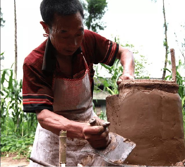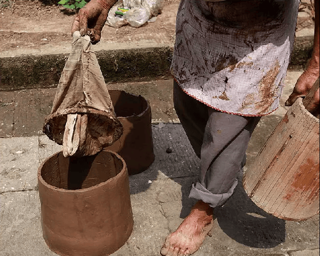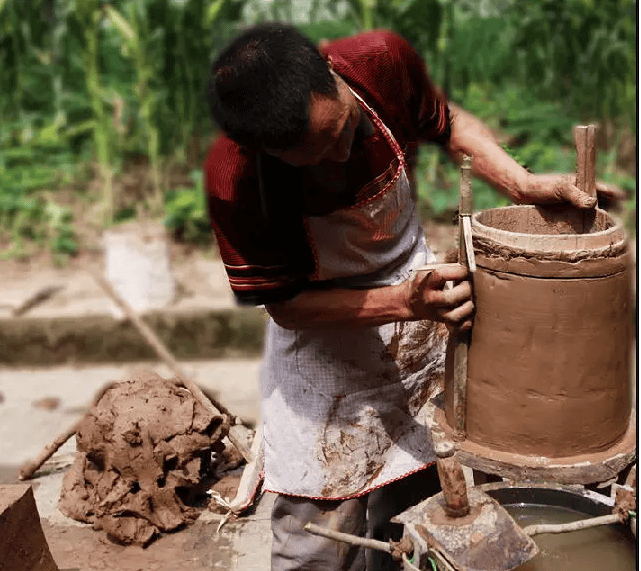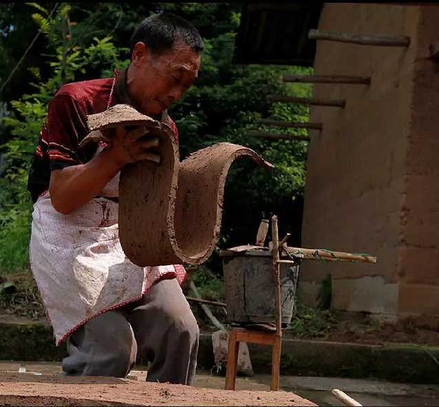 做瓦坯是一個轉盤上放一個桶瓦模具。有一點像老式木製水桶用多塊木條鑲起來的,只不過沒有桶底。製作瓦坯時,是用鋼絲弓在泥坯料上切割一塊厚約1cm寬有30cm長60多cm的泥坯料,並把它包在瓦模具上把接頭處的泥壓緊粘牢,去掉多餘的泥料然後用左手轉動模具盤,右手用一個弧形工具上下不停地打壓坯泥,並抹平坯泥,還要不時的沾點水磨光表面。