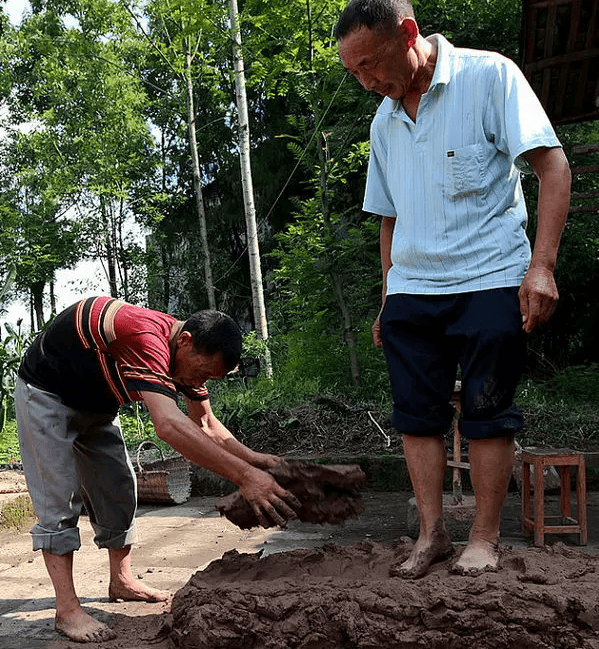 坯泥製作是第一關。打磚瓦的泥土是用當地粘性很強的黃泥巴。製作磚瓦場地,一般選在可以遮風擋雨的棚裏或房檐旁邊,並在平坦的土地上平整出一塊供涼曬瓦坯的場地。首先挖一個料坑。這個料坑是直徑約十米左右的圓坑。先把地表面不能用的沙土和腐泥土挑走,然後把坑挖一米深。能用的粘土留下,不夠的要從其他地方取土倒進坑內。料坑要用水泡兩三天,然後趕兩頭水牛進去、牽着水牛在坑內轉圈用水牛踩、直到把粘土踩勻,粘土要像和餃子面一樣可以擀餃皮了才行。這種坯泥用鋤頭是挖不起來的,只能用一種專門切割坯泥的弓子的工具來進行切割。這種弓子選用的是彈性忒好的小樹做弓把,用細鋼絲做弓弦。 用弓子把坑裏的坯泥切割下來,背到工棚裏碼在坯泥台子上。碼泥時要把泥打緊,不能有縫隙,外邊表面用板子拍打平整,用潮濕的草簾子蓋着,防止水分過早流失。