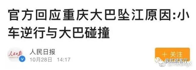 14:17分,人民日報官微蓋章,稱:官方回應重慶大巴墜江原因:小車逆行與大巴碰撞。