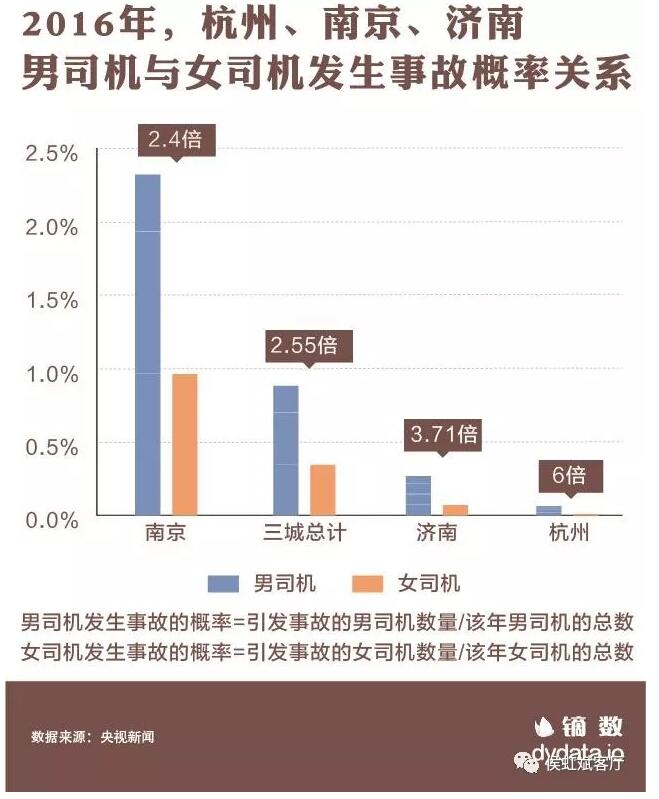 據中國公安部交管局發佈的數據,2016年,全國機動車駕駛人達3.6億。其中,女性駕駛人有9738萬人,而男性駕駛人有2.6億,約是女性駕駛人數量的2.7倍。男司機的基礎數量遠遠高出女司機。據統計,在2016年全年,杭州市男司機發生交通事故的概率是女司機的6倍,南京市為2.4倍,而濟南則是3.71倍。