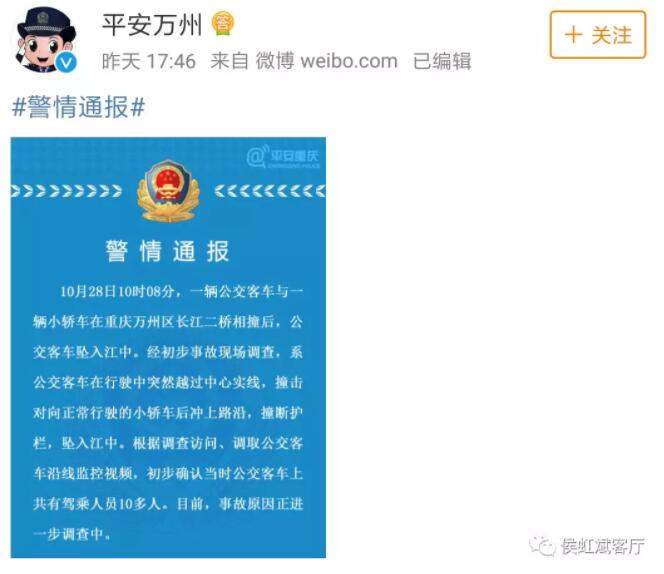 當天17時@平安萬州 通報:經初步事故現場調查,公交車在行駛中突然越過中心實線,撞擊對向正常行駛的小轎車後衝上路沿,撞斷護欄,墜入江中,共有駕乘人員10多人。從視頻來看, 大巴走到了逆行,撞了紅色轎車後,墜入江中。紅色轎車是無責的。