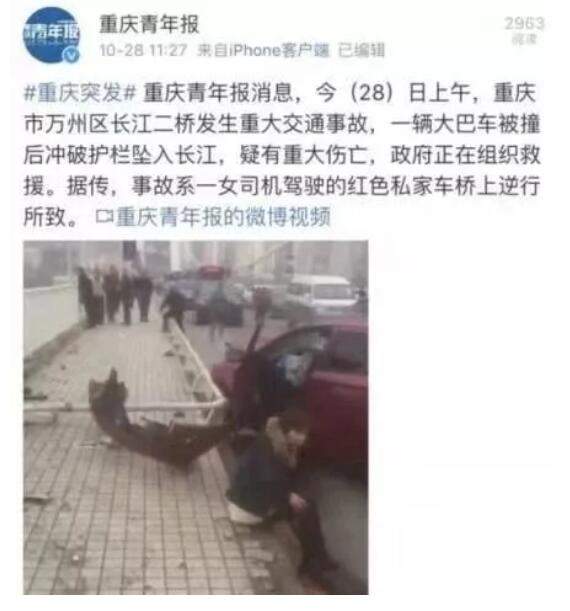 重慶青年報官微首發消息,報道車禍原因是“事故系一女司機駕駛的紅色私家車橋上逆行所致。”