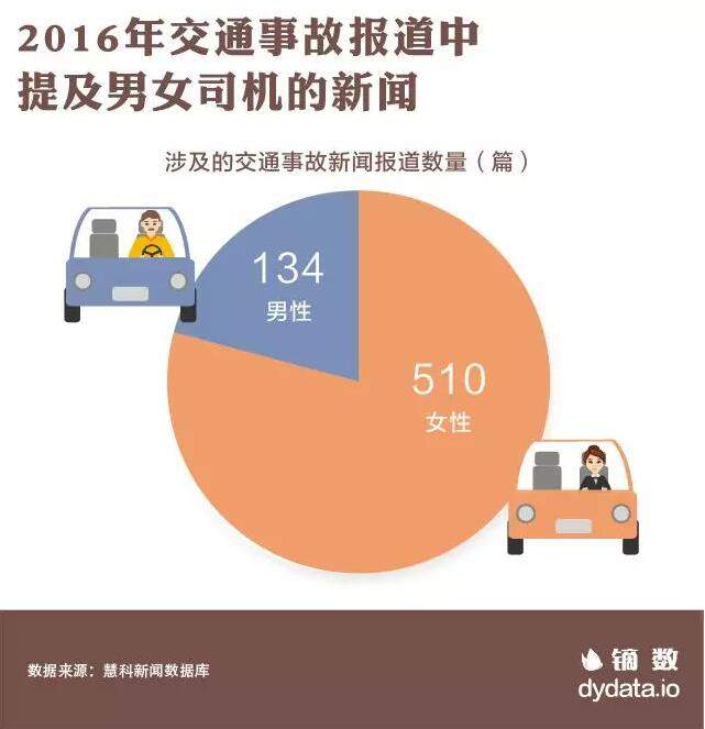 在2016年全國的交通事故報道中,新聞報道提到“男司機”的有134篇,而提到“女司機”的則有510篇,數量與提及“男司機”的相比,幾乎是男司機的4倍。