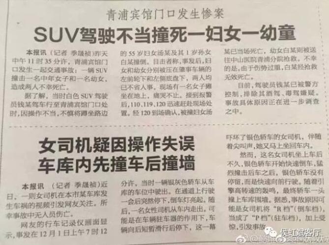 有一份報紙(《新民晚報》),一個版面上報道了兩條交通肇事新聞,上面的標題是:《SUV駕駛不當,撞死一婦女一幼童》,下面的標題是:《女司機疑因操作失誤,車庫內先撞車後撞牆》。