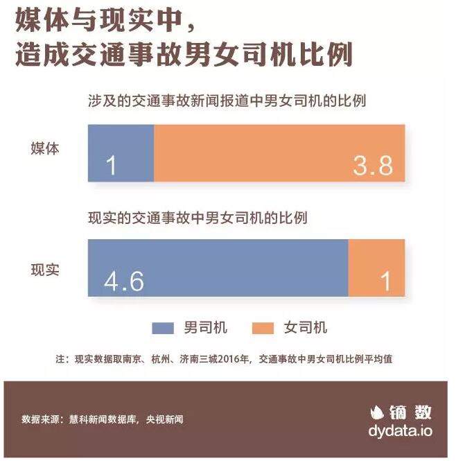 新聞媒體上,交通事故提到男女司機的比例是1:3.8;而現實當中車禍的男女比例是4.6:1。