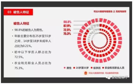 另外,據司法大數據研究院、司法案例研究院發佈的《司法大數據專題報告之危險駕駛罪(2017年)》中可以看到,被害人特徵:98.9%的被告人為男性。