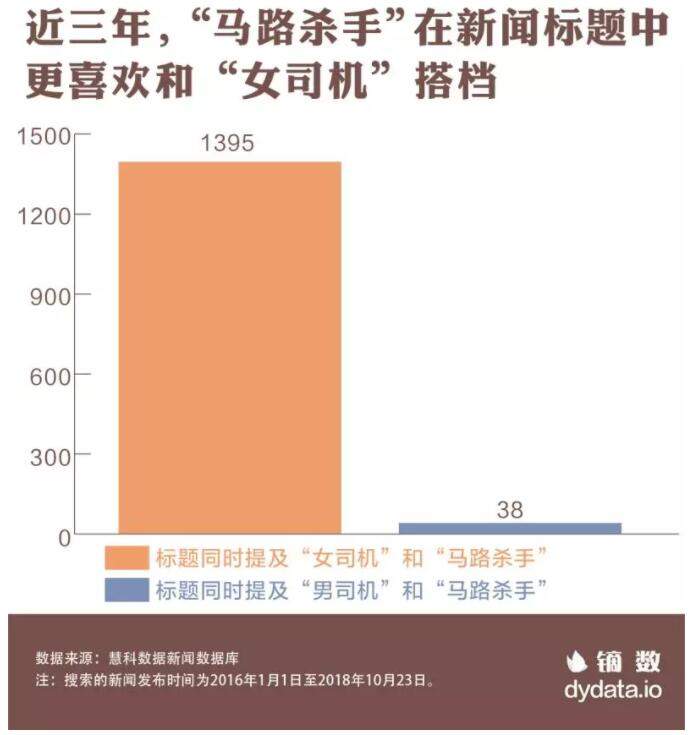 慧科新聞數據庫顯示,2016年來,**新聞標題中同時含有“女司機”和“馬路殺手”的文章有1395篇,**而同時提及“男司機”和“馬路殺手”的僅有38篇,僅為女司機的1/36。