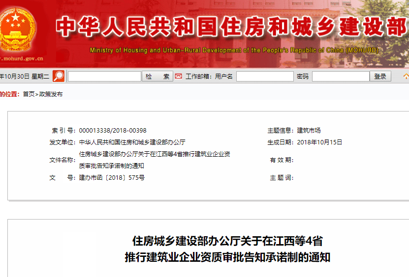 昨日,住建部發布了關於在江西等4省推行建築業企業資質審批告知承諾制的通知,通知顯示:2018年11月1日起,申請建築工程、市政公用工程施工總承包一級資質實行告知承諾審批。
