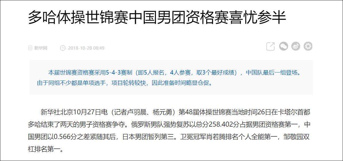 因為在資格賽中,中國男團從自由操項目開始出現失誤,鞍馬出現了兩人次掉下器械的重大失誤,在強勢項目吊環上更是表現得中規中矩,因此新華社曾用“喜憂參半”來形容中國男團的表現。