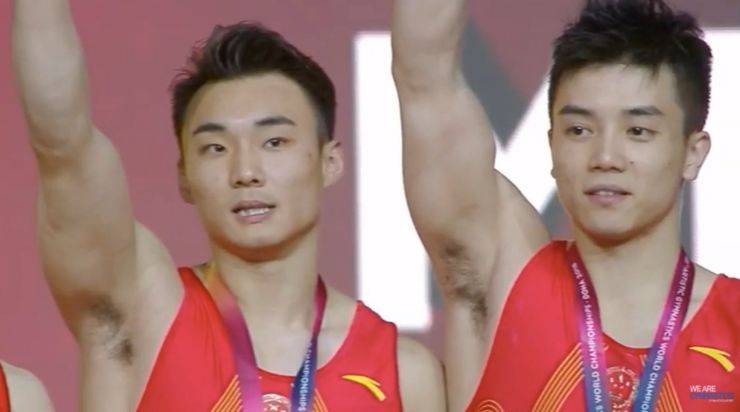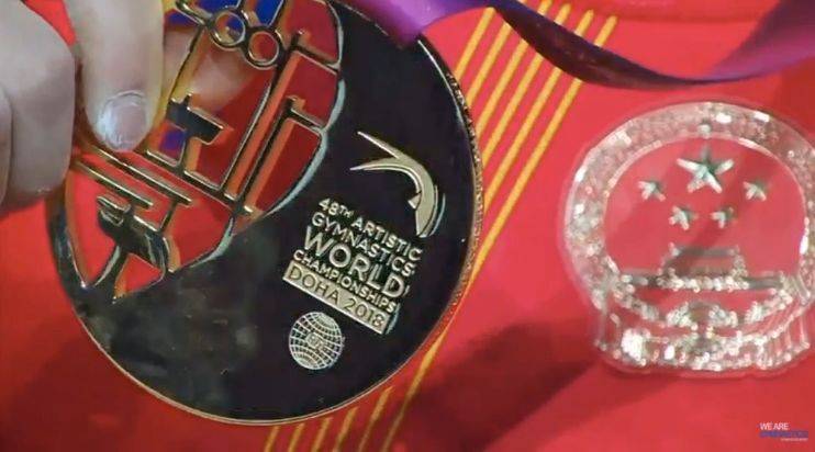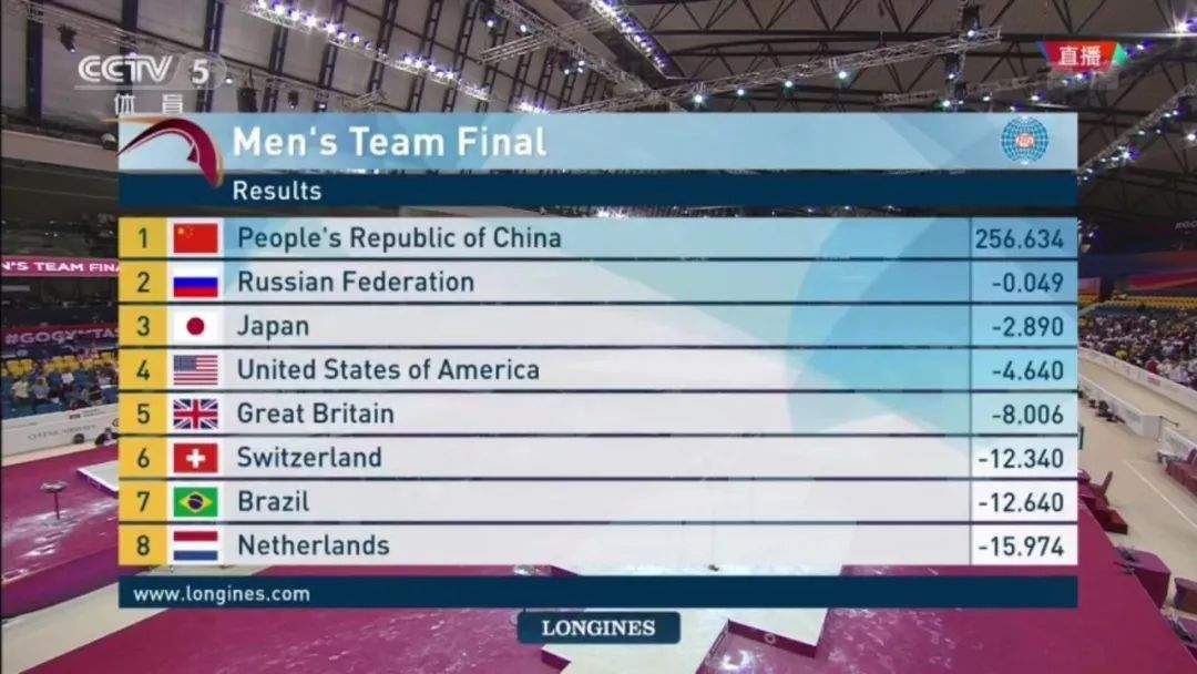 這是本週期中國隊團體首金,祝賀中國體操小夥們!特別要祝賀孫煒,成為新晉世界冠軍,可以和其他隊員一樣,登上冠軍牆了!