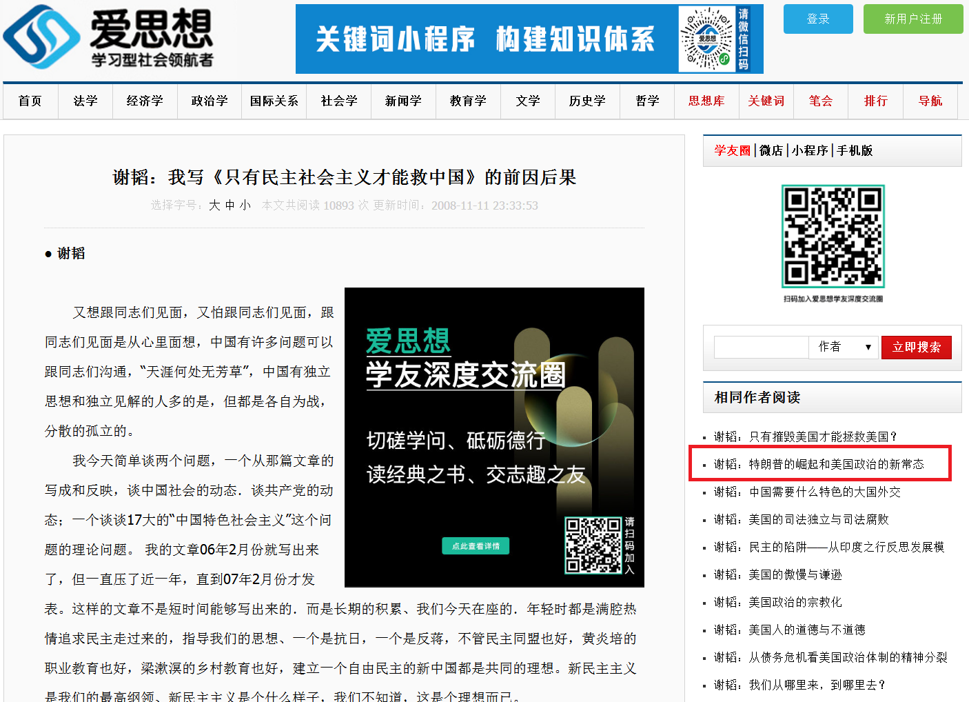 “個人與社會的不幸,引發了對馬克思主義長期深入的研究思考,並於垂暮之年厚積薄發。2007年春,86歲的謝韜在《炎黃春秋》雜誌發表了“民主社會主義模式與中國前途”一文,旋即成為21世紀初中國理論界最具爭議的人物。他指出,“二戰”後世界上曾存在三種制度模式,即以美國為代表的資本主義、以蘇聯為代表的暴力社會主義、**以瑞典為代表的民主社會主義。**謝韜認為,民主社會主義才是馬克思主義的正統;民眾富裕、官員廉潔的民主社會主義在歐盟及北歐國家獲得了巨大成功,是具有普世價值的和諧社會模式。
