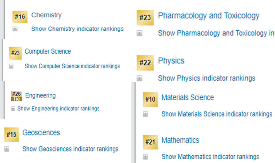 這個排名的依據是這樣的:全球研究聲譽12.5%,地區性研究聲譽12.5%,發表論文10%,出版書籍2.5%,學術會議2.5%,標準化引用影響10%,總被引用次數7.5%,高頻被引文獻數量(在引用最多文獻的前10%)12.5%,高頻被引文獻百分比(在引用最多文獻的前10%)10%,國際合作10%,高頻被引文獻數量(在各自領域被引次數最多的前1%)5%和高頻被引文獻百分比(在各自領域被引次數最多的前1%)5%。
