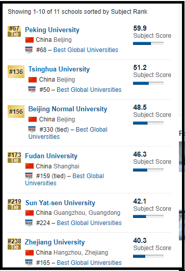 社科類的榜單稍微好一點,共有11所大學上榜,最高的還是北大,其次還是清華。