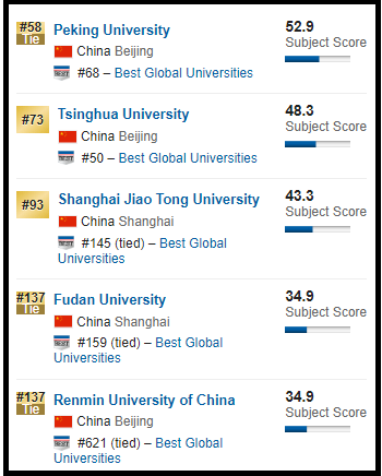 藝術人文這種沒有中國榜單。經濟商科的榜裏,中國只有9個大學上榜,排名最高的是北大,世界58