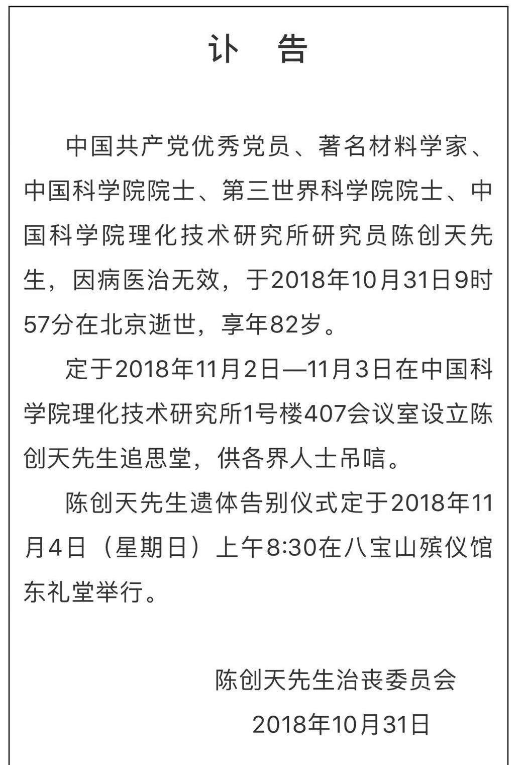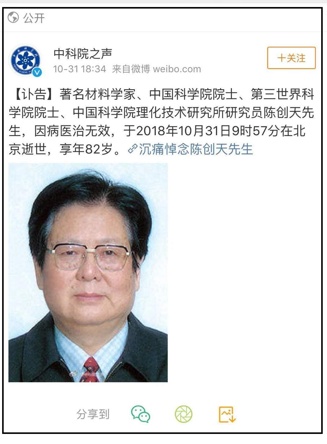 @中科院之聲:【訃告】著名材料學家、中國科學院院士、第三世界科學院院士、中國科學院理化技術研究所研究員陳創天先生,因病醫治無效,於2018年10月31日9時57分在北京逝世,享年82歲。
