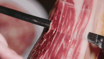 但中國人吃火腿,在意的是烹飪後的味道,而哈武戈小鎮上的西班牙火腿**,切片,生食,更像一場充滿儀式感的互動表演。**