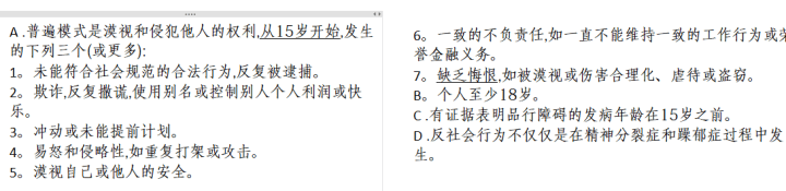 在最新版的《精神疾病診斷與統計手冊》(DSM-5)上,共有異常、戲劇、焦慮,其他等幾大羣人格障礙。其中反社會人格和邊緣型、戲劇型、自戀型一起被歸在B型戲劇或情感型疾患裏(dramatic, emotional or erratic disorders)。如其名,這一類型患者的特質是其戲劇的、過於情緒化的,或者無法預測的想法和行為。