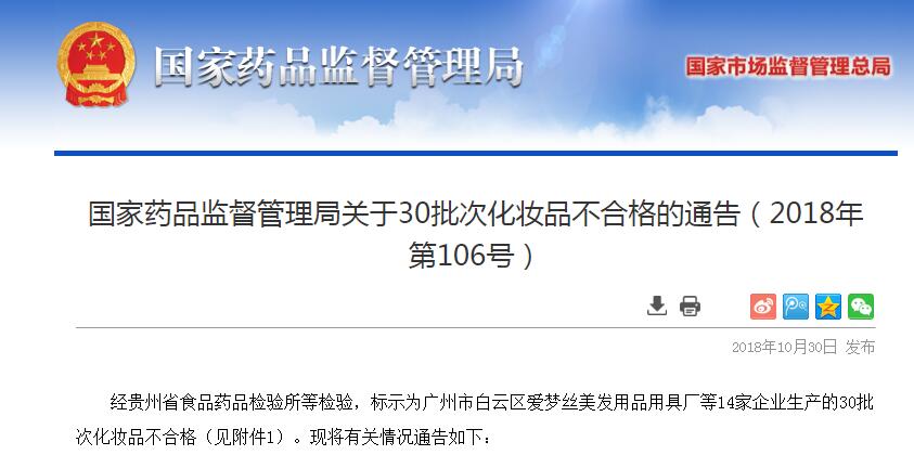 據國家藥品監督管理局網站消息,國家藥品監督管理局30日發佈《關於30批次化妝品不合格的通告(2018年第106號)》。通告稱,經貴州省食品藥品檢驗所等檢驗,標示為廣州市白雲區愛夢絲美髮用品用具廠等14家企業生產的30批次化妝品不合格。