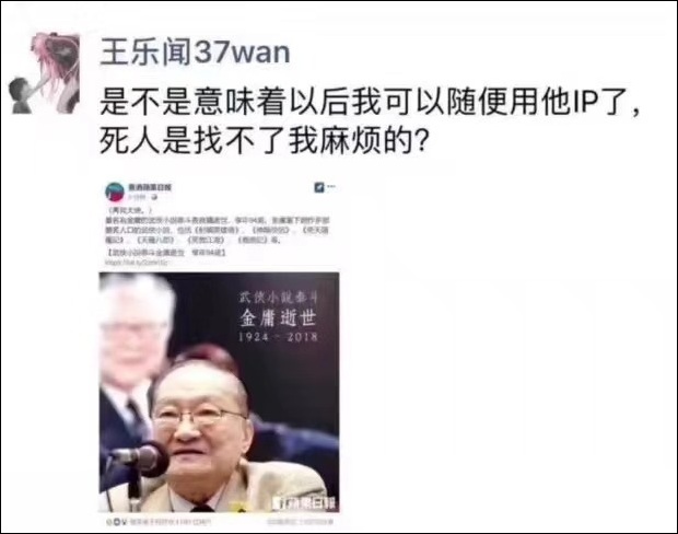 第一反應卻是金庸持有的版權IP是不是可以隨便使用了,只因為**“死者是找不了我麻煩的”**???