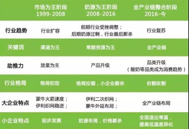 回顧乳業二十年來的發展階段,從市場為王時代( 1999 - 2008 年)到奶源為王時代( 2008 - 2016 年) 再到現如今的全產業鏈整合能力為王時代( 2016 年 - 今天) 。二十年來,有競爭,有合作,有高潮,也有低谷。