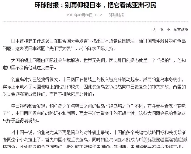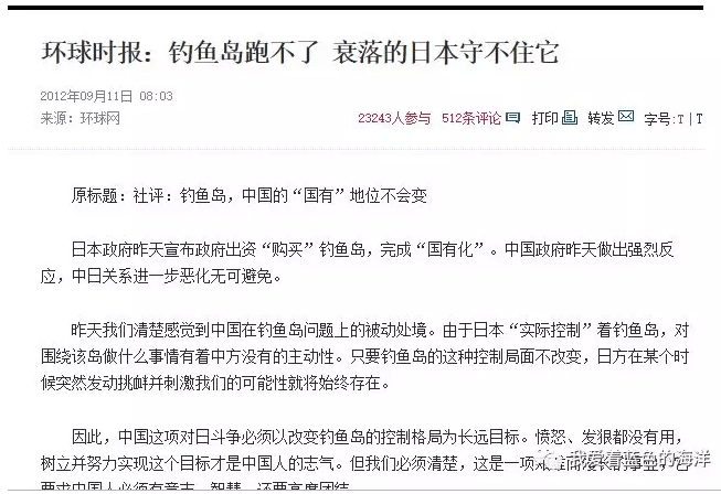 〝小可〞接着又翻出了《環時》2012年9月11日發表的一篇煽動國人〝保釣〞反日的文段,其文稱——〝保持並擴大爭議都必須有行動,在釣魚島問題上這些行動就是民間保釣,組織漁船前往作業,中國執法船越來越頻密的巡航等等。隨着日方控制行為的加碼,我們的行動也要不斷升級。與日本不是鬥一天兩天,未來幾十年中國的發展需要不斷壓到釣魚島上。〞