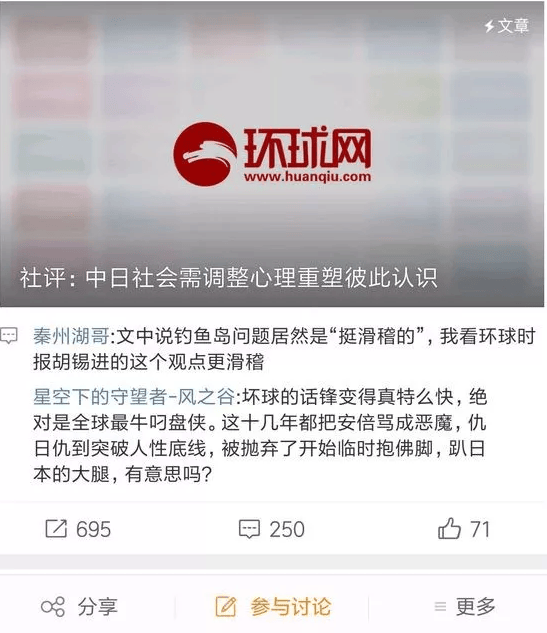 針對《環時》的社評把中日關係惡化的原因歸結為日本右翼〝挑事〞的説法,網名為〝小可〞的作者撰文反問道,〝什麼?日本右翼‘鬥志昂揚’的原因,竟然是中日社會沒有淡化歷史?!