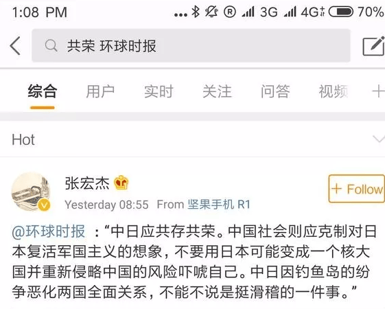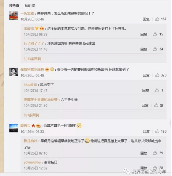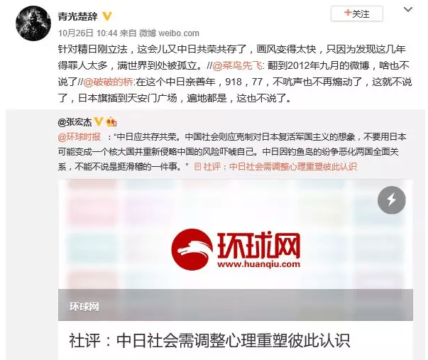 以往一貫在對日問題上高舉〝民族主義〞大旗發表激昂言論的《環時》,現在突然改弦更張,把日本侵華時期汪精衞偽政權宣揚的中日〝共存共榮〞闡述為當今中日關係的〝大原則〞,令一眾中國網友驚呆。