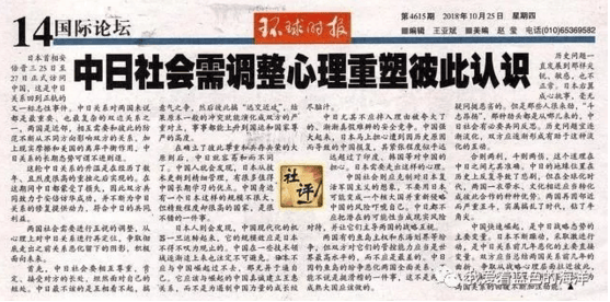 據瞭解,《環時》10月25日發表的那篇招致輿論反彈的社評,以〝中日社會需調整心理 重塑彼此認識〞為主題,一反常態地開始〝反省〞過去緊張的中日關係。其文聲稱,〝中日最不該的是互相看不起,搞意氣之爭。〞又稱由於中日相互搞〝遠交近攻〞,導致〝原本一般的衝突就能演化成雙方的嚴重對立,事事都能上升到國運和國家尊嚴的高度〞云云。