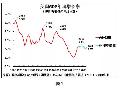 數據再次顯示,與其他計算方法一樣,美國GDP增長下降趨勢如出一轍。按照5年移動平均線計算,美國GDP年均增長率從1966年的5.9%,降至1987年的4.6%,2000年的4.3% , 2016年的2.2%。根據IMF預測,2023年美國GDP年均增長率將進一步降至1.8%。因此,數據再次顯示,IMF對特朗普政府要實現其所宣稱的增速不抱信心。相反,IMF預測,美國經濟增速將進一步放緩。