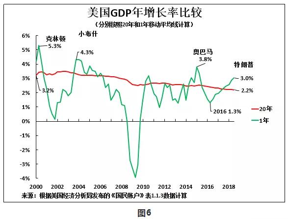 特朗普政府的虛假宣傳手段,是試圖讓人將美國經濟週期的短期性好轉,誤認為美國經濟實現了歷史性增長。確切地説,如圖6所示,2016年第二季度美國GDP同比增速低至僅1.3%,比按照20年移動平均線計算的年均增長率低0.9%。因此,僅僅要維持2.2%的長期平均增速,美國GDP年增長率就必須超過長期平均增速0.9個百分點 ,即要達到約3.1%。因此,按照同比增長計算,特朗普治下的3.0%的GDP增長峯值,是二戰結束以來的13位美國總統中最低的,甚至並未達到約3.1%的增速。這表明,美國經濟並未加速增長。事實上,特朗普治下的美國GDP增速只是在此前的基礎上温和增長,但這並不表明美國中長期經濟顯著增長。