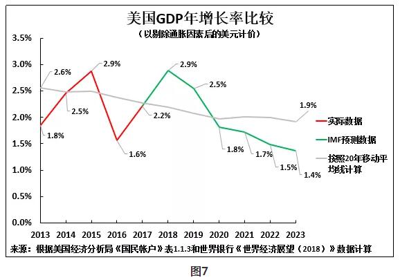 通過比較美國經濟週期趨勢與美國中長期經濟增速,就會明白特朗普政府試圖掩蓋美國經濟的真實狀況的原因。為體現這一點,圖6為大家呈現按照20年移動平均線計算和1年移動平均線計算的美國GDP年均增長率。數據印證了美國實際經濟趨勢與經濟理論預測的分析一致。即: