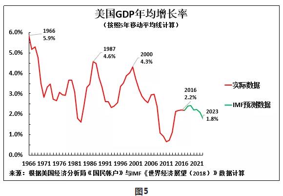 因為IMF預測的數據涵蓋特朗普有可能的兩任任期——八年中的七年,圖4為大家呈現按照7年移動平均線計算的美國GDP年均增長率。與其他計算方法一樣,按照這種方法計算的結果顯示,美國經濟正在穩步放緩:美國GDP年均增長率從1968年的 5.3%,降至1989年的4.4%, 2000年的4.0%, 2016年的2.2%。要在特朗普的兩屆任期內實現5-6%的增長率,特朗普政府就得實現過去五十年從未實現過的增速,而美國GDP年均增長率已係統性地放緩了五十年。