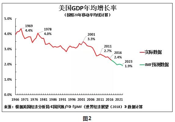 按照歷史標準,特朗普治下的美國經濟增長放緩,只不過是過去五十年來美國經濟長期放緩的一個縮影而已——美國經濟長期放緩是美國經濟最重要的特徵之一。如圖2所示,以能消除短期經濟週期波動影響的20年移動平均線計算,美國GDP年均增長率從1969年的4.4%,降至1978年的4.0%,2001年的3.3%, 2016年(特朗普就任總統的前一年)的2.4%。