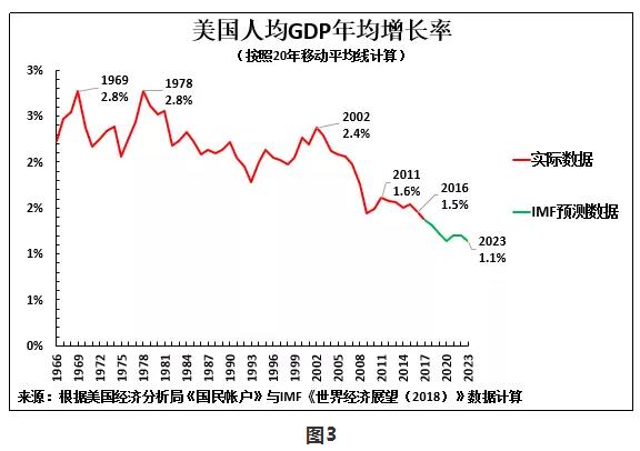 因為美國人口增長率相對較快——2017年美國人口增長0.7%,美國人均GDP增速實際上顯著低於美國GDP增速。如圖3所示,美國人均GDP年均增速從1969 -1978年的2.8%,降至 2002年的2.4% , 2016年的1.5%。根據 IMF預測, 2023 年甚至將降至1.1%。