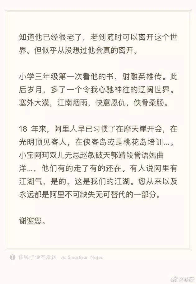 金庸去世,馬雲彭蕾發文悼念,淘寶官方:江湖仍在,永失我愛_風聞