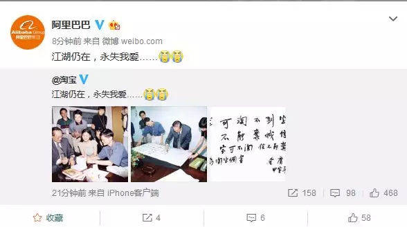 淘寶也發佈微博緬懷金庸先生稱,“江湖仍在,永失我愛……”。並曬出了馬雲與金庸先生的合影,以及金庸為淘寶的題詞。