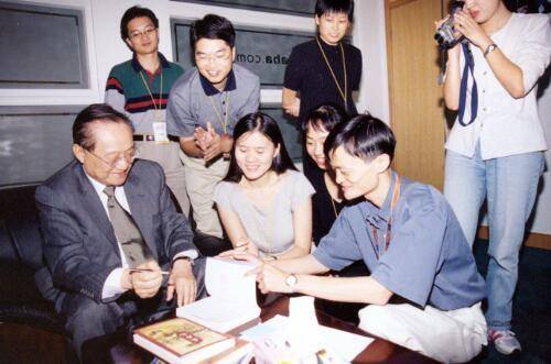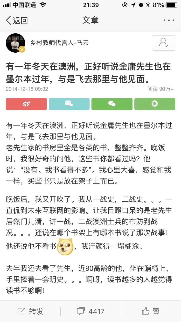 阿里巴巴董事局主席馬雲,是金庸的武俠小説迷,他曾在微博中寫過與金庸老先生切磋”學識“的一幕,自嘲實在金庸老先生面前,班門弄斧。