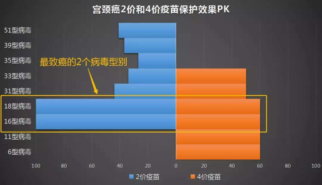 也就是説,有理由認為:在針對最致癌的病毒型別上,2價疫苗比4價和9價疫苗技高一籌。